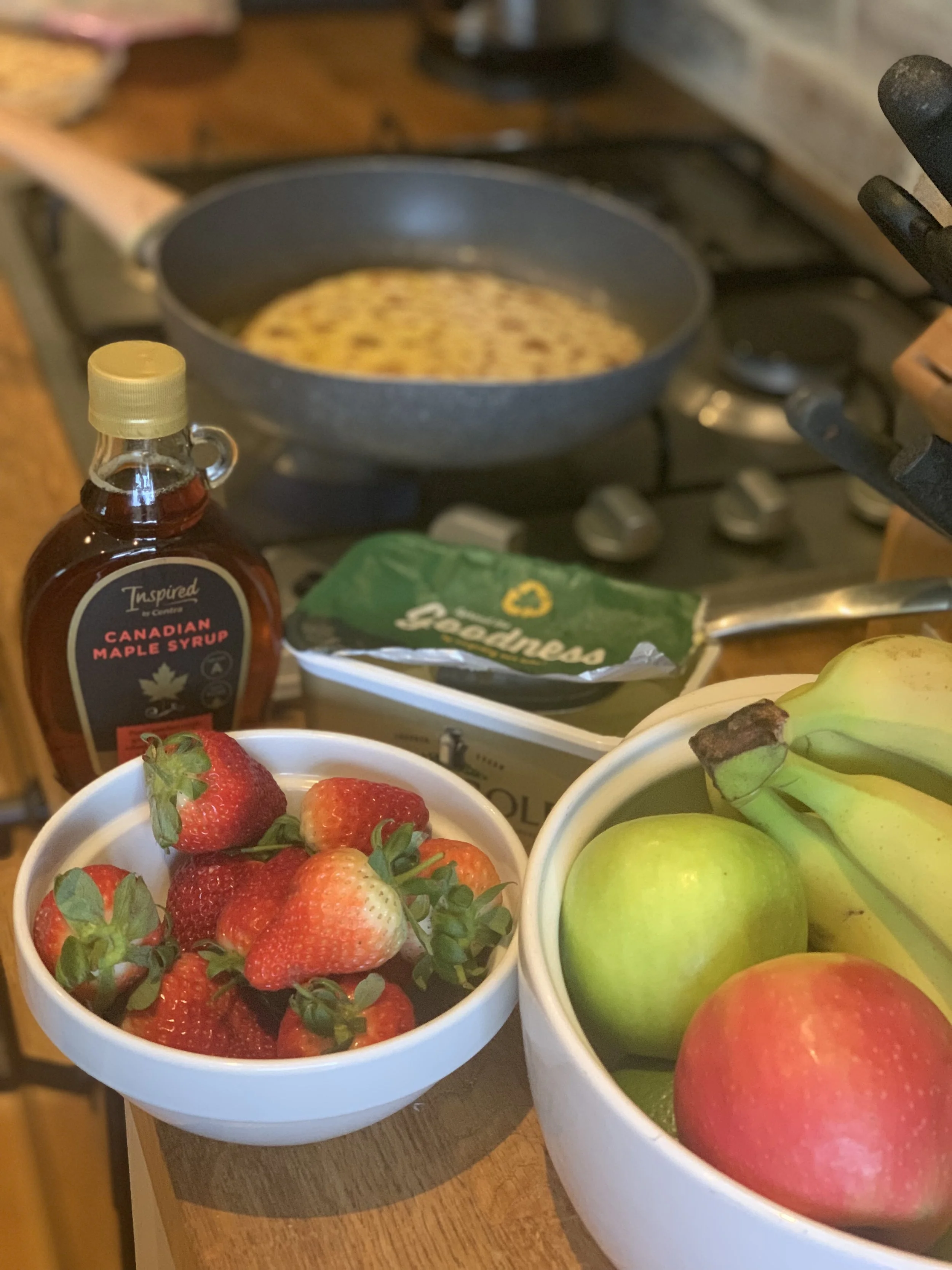 Assemble. Fold the pancake on a plate, top with strawberries and banana, and drizzle generously with maple syrup.